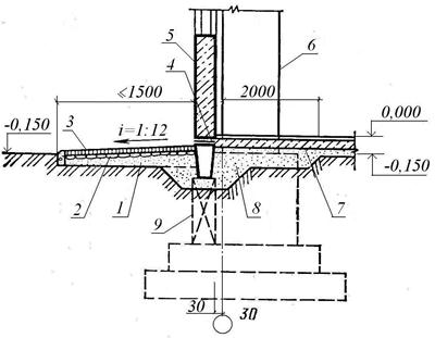 Вдоль фундаментных балок на поверхности грунта устраивают тротуар или отмостку с уклоном от стен здания 3 … 5 % для отвода поверхностных вод.