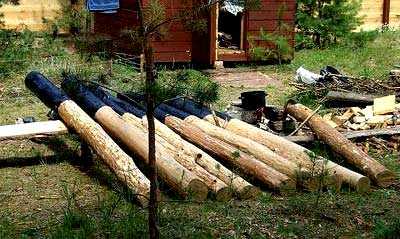 Это самый важный этап в возведении деревянного столбчатого фундамента. При этом стоит знать, что заготовку бревен под столбы лучше всего проводить в холодные месяцы в период ноябрь-январь. Древесину обязательно нужно заранее ошкурить и наметить верхнюю и нижнюю части в соотвествии с ростом бывшего дерева.