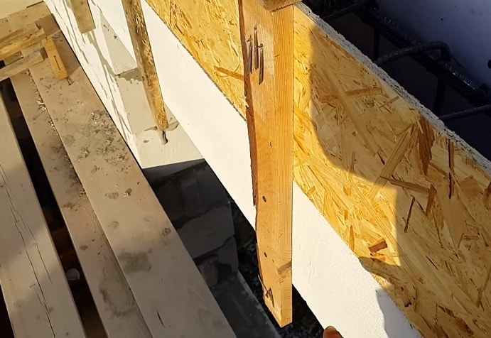 Если основание дома имеет высокую цокольную часть, то при строительстве опалубки с ОСБ выше уровня грунта необходимо своими руками создавать дополнительные ребра жесткости. Откосы с деревянных брусьев, дополнительно укрепляющие пластичные плиты ОСП через каждые 0.5 – 0.7 метров, помогут избежать деформации правильной геометрии фундамента во время его заливки.
