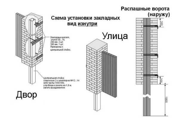 Рекомендую почитать более подробно статью по ссылке — устройство фундамента под столбы. Опоры под ворота и калитку выполняются усиленными сердечниками из металла, к которым привариваются закладные детали. Сердечник может быть из трубы диаметром 15см, из спаренного швеллера №16, сваренного «в коробочку» и прочих материалов.