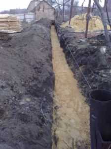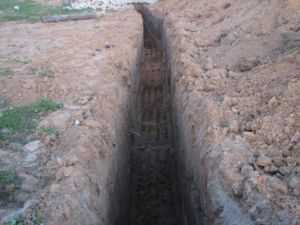 - В соответствии с разметкой натягивается шпагат и по нему выкапывается траншея глубиной в 50−80 см.