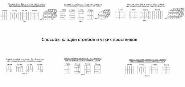 Кладку ведут с перевязкой (смещением) — шов нижнего ряда перекрывается «телом» кирпича, лежащего сверху. Шов стандартный — 8-10 мм. Схема кладки столбиков на фото: