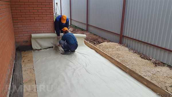 Укладывают материал после выравнивания песчаного слоя. Он надежно удерживает щебень и не дает ему проникать в песок.Иногда собственники жилья останавливаются на этом этапе. Однако полный цикл укладки многослойной отмостки предполагает наличие декоративного слоя. В этом случае поверх щебня укладывается еще один слой геотекстиля. Потом выполняют монтаж плитки, брусчатки или другого выбранного материала.