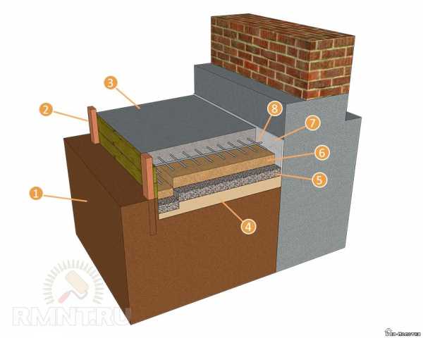 Общая схема бетонной отмостки:1 — материнский грунт; 2 — опалубка; 3 — бетонная отмостка; 4 — глиняный замок; 5 — гравийная подготовка; 6 — песчаная подготовка; 7 — демпферная лента; 8 — арматура