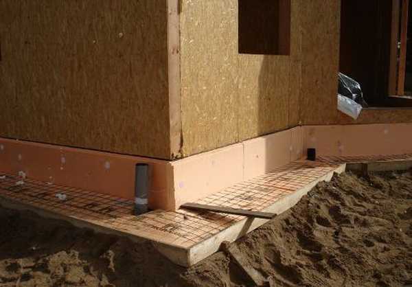 Простейший способ добиться такой схемы устройства — оклеить нижнюю часть цоколя полосой пенополиуретана толщиной около 20 мм. Разделитель садится на клеевую мастику, по мере монтажа верхний край выравнивается по шнуру, задавая уклон покрытия в сторону прилегающего грунта не менее 3:100. Впрочем, разделительный материал можно обрезать по общей линии после высыхания клея, но принцип остаётся прежним: опалубка и разделительный слой служат маяками для выравнивания бетонной смеси.