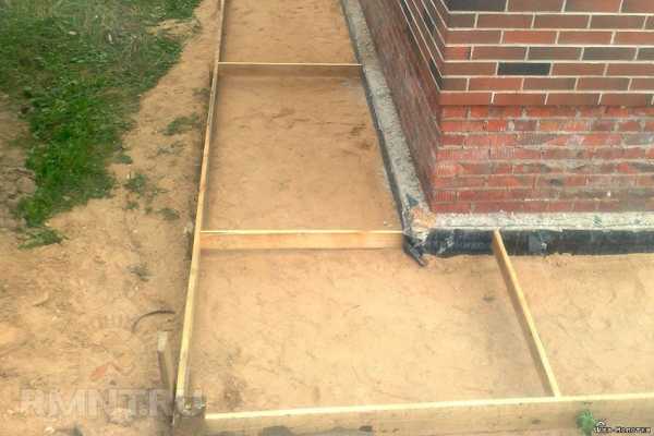 С внутренней стороны перпендикулярно опалубке ребром вверх устанавливаются деревянные рейки, примыкающие к стене дома. Они служат для устройства деформационных швов, а также определения уровня наклона отмостки к дому.