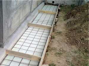 В получившиеся секции укладывают арматурную сетку из проволоки диаметром 3 мм и более и ячейками 100х100 мм. Сетку располагают на подложках таким образом, чтобы она находилась посредине толщи бетона. Далее укладывают слой бетона толщиной около 10 см, уплотняют, выравнивают и выполняют железнение. Бетон готовят из цемента М400, песка и щебня в соотношении 1:3:5.