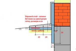 При выполнении нужно не забывать, что не должны соединяться фундамент и отмостка. Для чего по периметру фундамента нужно сделать компенсационный шов, шириной приблизительно 3 см. Как правило, это либо в два слоя уложенный рубероид, закрепленный к фундаменту, либо полосы из пенопласта толщиной 3 см.