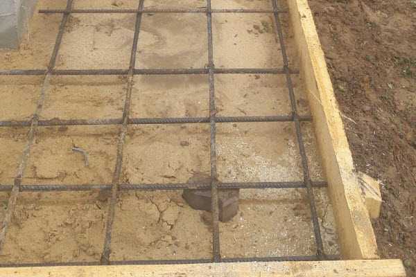 Сначала устанавливают поперечные опорные прутки под углом, равным уклону отмостки, затем укладывают нижний ряд арматурной решетки. Между ними устанавливают разделительные элементы, их проще всего сделать из проволоки.