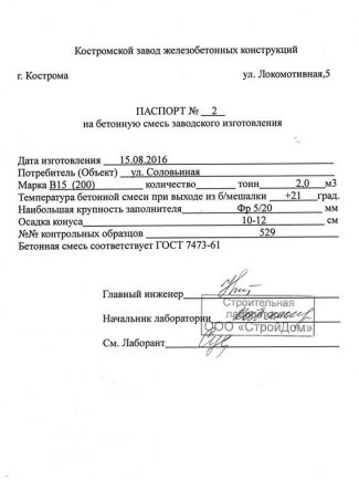 Паспорт на бетонЭтот документ в обязательном порядке выдается каждому покупателю на отдельный вид продукции. В нем отражаются основные показатели, а именно марка и класс, прочность. Данные заполняются по результатам серии испытаний. Помимо этого, в паспорте содержится информация о:
