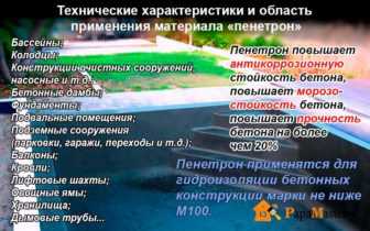 - Пенетрон не влияет на основные физические параметры бетонной смеси: подвижность, прочность, сроки схватывания и т. д., за исключением водонепроницаемости. Обработанный Пенетроном бетон сохраняет паропроницаемость, бетон «дышит».