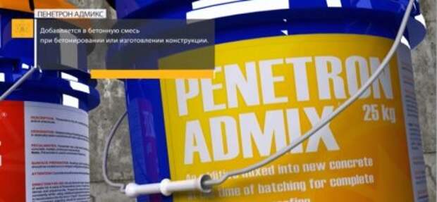 «Пенетрон Адмикс» представляет собой сухую рационально подобранную смесь; состоящую из специального цемента и различных запатентованных химических добавок, с целью гидроизоляции всей толщи бетона. Пенетрон Адмикс относиться к первичной форме защиты бетона и позволяет исключить дополнительную гидроизоляцию конструкции или изделия после набора прочности.