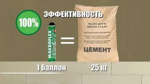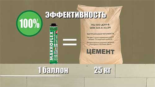 Считается, что стандартный аэрозольный баллон жидкого материала объемом в 850 мл позволяет заменить 25 кг мешок цемента марки М400. При этом мастеру не придется тратить время и энергию на приготовление раствора и его переноску к месту возведения конструкции, что значительно сокращает затраты на оплату труда при производстве строительных и отделочных работ.
