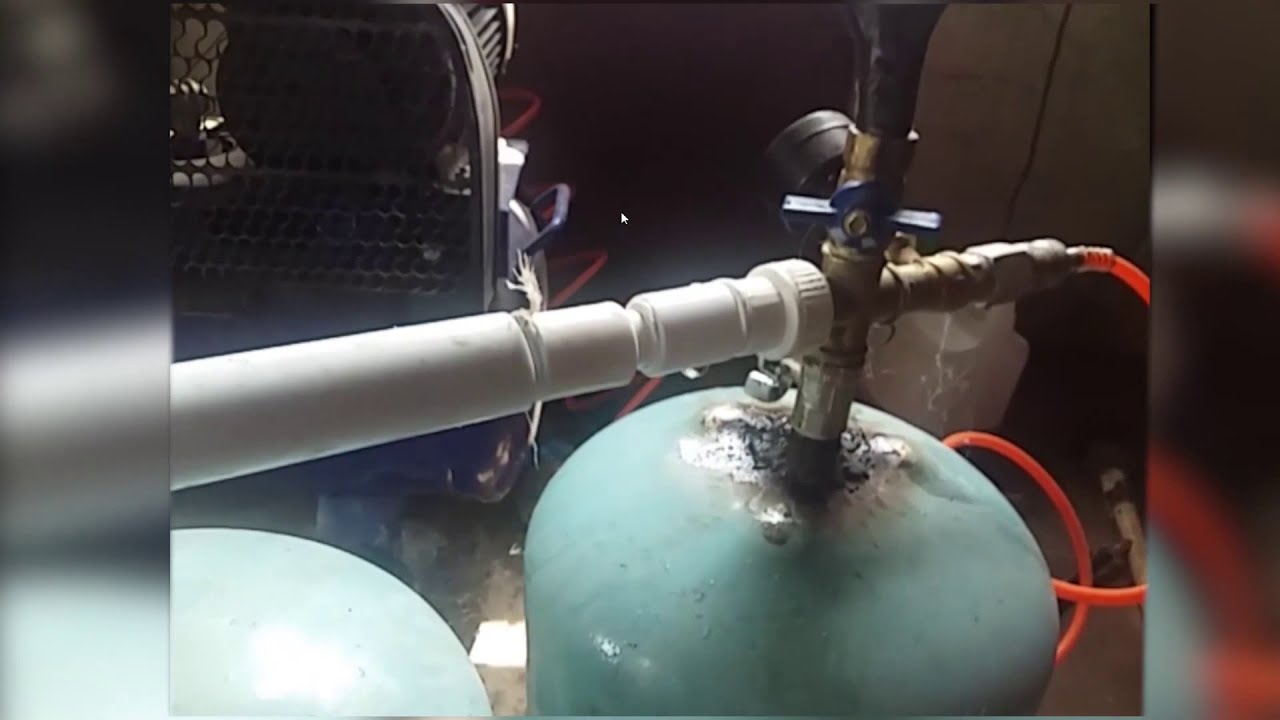 На каждом из патрубков нужно установить обычные сантехнические краны, с помощью которых будет регулироваться поток пены и подача воздуха из компрессора. Один вывод накопительной емкости соединяется с дюймовой трубой, внутрь которой необходимо забить полиэтиленовую мочалку.На ее противоположном выходе устанавливается фильтр, предназначенный для улавливания мелких кусочков мочалки. Второй вывод резервуара подсоединяется к шлангу компрессора.