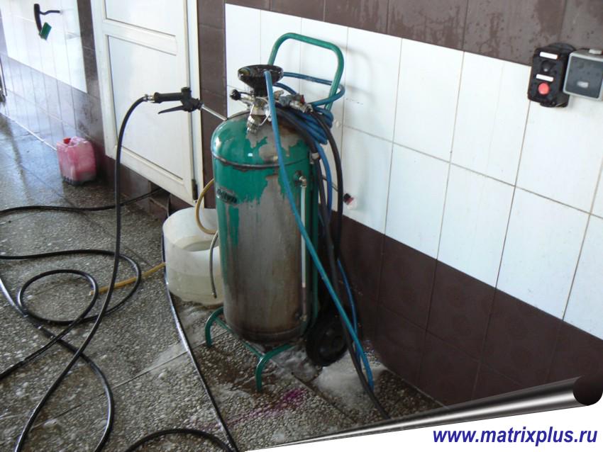 - Готовый пенный раствор распрыскивается через форсунку пистолета на обрабатываемую поверхность.