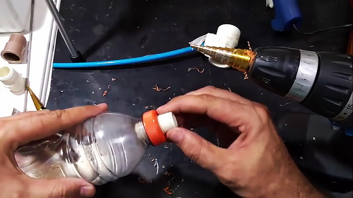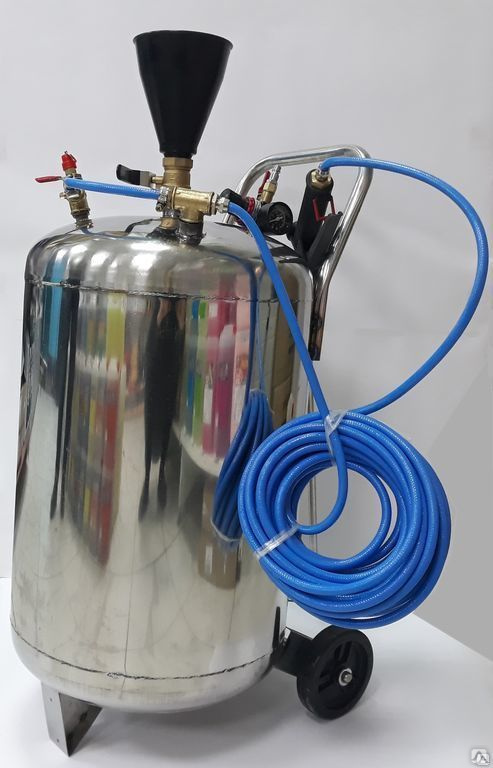 Второй способ позволит сделать агрегат, близкий по конструкции к промышленному. Для этого понадобится компрессор, который создаст достаточный уровень мощности. Кроме того, нужно будет взять ёмкость с толстыми стенками. Это может быть садовый опрыскиватель.