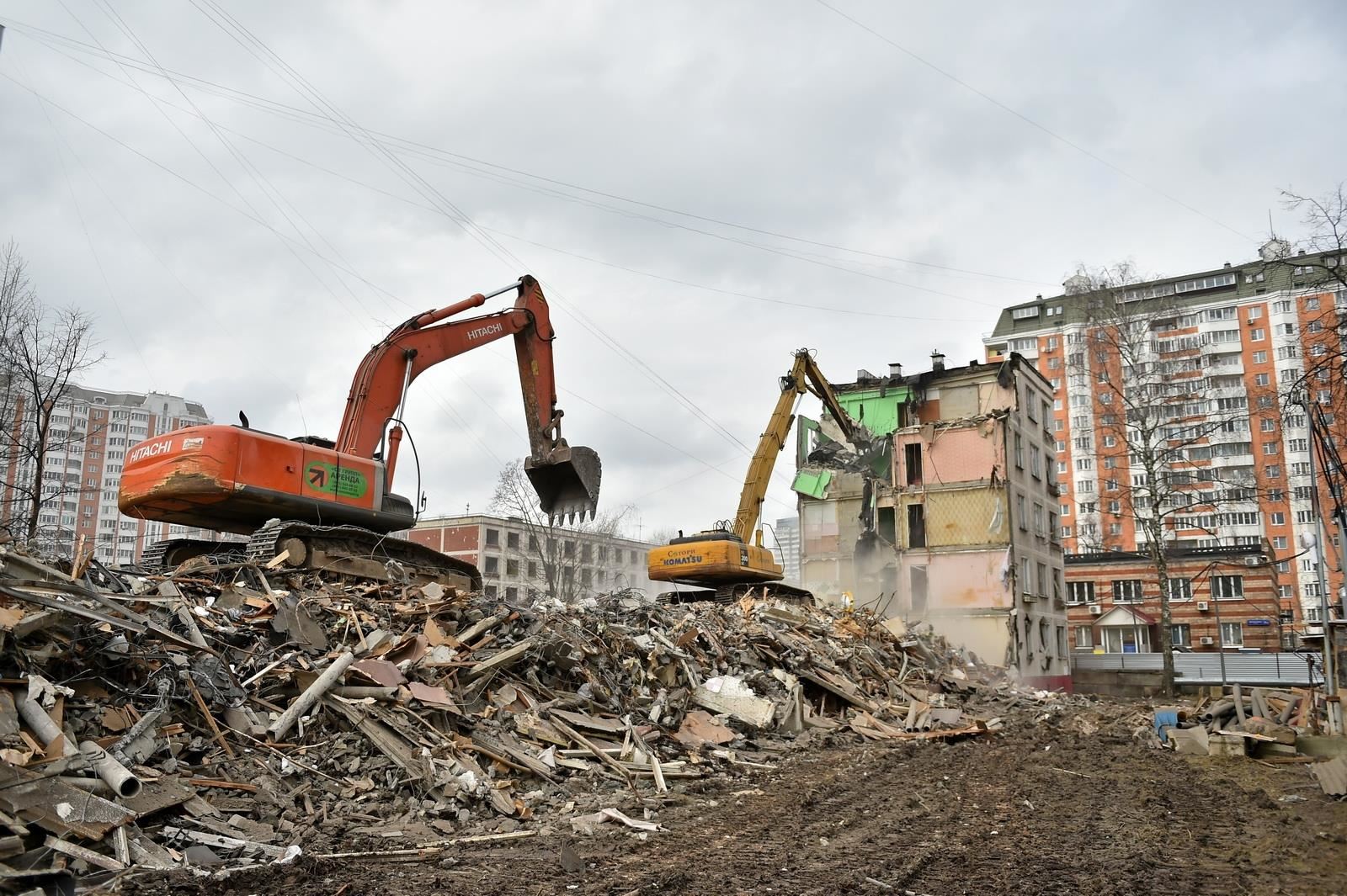 Наместе демонтажа, появившиеся строительные отходы, 40% которых этожелезобетонный лом, разбираются и сортируются при помощи экскаваторов.