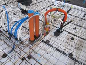 Залитый раствор в глубине уплотняют с помощью вибраторов гильзового типа. Гильза вибратора легко проникает в ячейки арматурной сетки. Этим достигается качественное уплотнение бетона на всю глубину плиты.