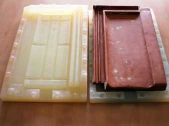 В отличие от фабричной технологии, процесс будет осуществляться не вибролитьем, а поштучным профилем. Для формирования каждого фрагмента вам придется приобрести полиуретановую формовку для штампования бетона. Для того чтобы правильно формовать листы, слой бетонированного состава наносят на чистый металлический лист и оставляют на определенное время. После этого из пласта сырья вырезают элементы черепицы.