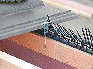 После укладки нижнего ряда черепицы выполняют разметку вертикальных рядов цементно-песчаной черепицы и укладывают черепицу по рядам снизу вверх от середины ската в направлении хребтов. Для крепления резаной черепицы есть специальный зажим на проволоке. | ||