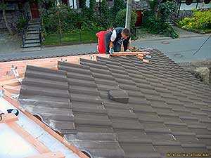 | Для резки цементно-песчаной черепицы применяйте угловую отрезную пилу мощностью примерно 2 кВт и алмазный диск для сухой резки тяжелого бетона диаметром 230 мм. Наибольшая производительность и лучшая точность достигаются при резке черепицы на станке с водяным охлаждением. Не режьте черепицу непосредственно на кровле, так как это небезопасно для кровель щика и может привести к повреждению уже уложенной черепицы. | Чтобы избежать конденсата в утеплении мансардного этажа, конструкция ската крыши должна быть вентилируемой. Современные конструкции крыш предполагают наличие дополнительного слоя подкровельной гидроизоляции. В зависимости от вида материала вентзазор под кровлей может быть двойным или одинарным. Укладывать непосредсвенно на утеплитель допустимо только многослойные супердиффузионные мембраны с паропроницаемостью не менее 750 — 1000 г/м2за сутки. | ||