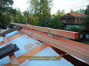 | Вентилируемые коньки устанавливаются на прогоны из бруска на стальных опорах. Коньковый брус должен иметь сечение не менее 5 х5 см и закрепляться в держателях при помощи оцинкованных гвоздей 2,5х25 мм (по 4 гвоздя на каждое крепление). | Подкровельные пленки укладываются поверх фартука свеса или капельника (карнизной планки) с нахлёстом не менее 10 см. Выполняя подшивку карнизного свеса, необходимо обеспечить приток воздуха под гидроизоляционную пленку. | ||