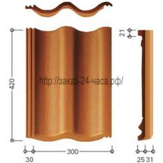| В ассортимент цементно-песчаной черепицы входят как сами кровельные плитки, так и различные фасонные изделия для кровли и обеспечения вентиляции подкровельного пространства. | Перед нами Франкфуртская или двойная итальянская черепица производства Браас. Эта модель черепицы выпускается уже более 60 лет. | ||