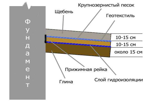 ΠΠ°ΠΆΠ½ΠΎ! ΠΠ»Ρ ΡΠΎΠ³ΠΎ ΡΡΠΎΠ±Ρ ΠΎΡΠΌΠΎΡΡΠΊΠ° ΠΈΡΠΏΡΠ°Π²Π½ΠΎ ΠΎΡΠ²ΠΎΠ΄ΠΈΠ»Π° ΡΡΠΎΠΊΠΎΠ²ΡΠ΅ Π²ΠΎΠ΄Ρ ΠΎΡ ΡΡΠ½Π΄Π°ΠΌΠ΅Π½ΡΠ° Π΄ΠΎΠΌΠ°, Π³ΠΈΠ΄ΡΠΎΠΈΠ·ΠΎΠ»ΡΡΠΈΠΎΠ½Π½ΡΠΉ Π³Π»ΠΈΠ½ΡΠ½ΡΠΉ ΡΠ»ΠΎΠΉ Π½ΡΠΆΠ½ΠΎ ΡΠΊΠ»Π°Π΄ΡΠ²Π°ΡΡ Ρ ΡΠΊΠ»ΠΎΠ½ΠΎΠΌ ΠΊ Π²Π½Π΅ΡΠ½ΠΈΠΌ Π³ΡΠ°Π½ΠΈΡΠ°ΠΌ ΠΊΠΎΠ½ΡΡΡΡΠΊΡΠΈΠΈ. ΠΠ΅Π»ΠΈΡΠΈΠ½Π° ΡΠ³Π»Π° ΡΠ°ΠΊΠΎΠ³ΠΎ ΡΠΊΠ»ΠΎΠ½Π° Π½Π΅Π²Π΅Π»ΠΈΠΊΠ° ΠΈ ΠΌΠΎΠΆΠ΅Ρ Π²Π°ΡΡΠΈΡΠΎΠ²Π°ΡΡΡΡ Π² Π΄ΠΈΠ°ΠΏΠ°Π·ΠΎΠ½Π΅ ΠΎΡ 5 Π΄ΠΎ 8 Π³ΡΠ°Π΄ΡΡΠΎΠ², Ρ.Π΅. ΠΏΡΠΈ ΡΠΈΡΠΈΠ½Π΅ ΠΎΡΠΌΠΎΡΡΠΊΠΈ 80 ΡΠΌ ΠΈ ΡΠ³Π»Π΅ ΡΠΊΠ»ΠΎΠ½Π° 6Β Π³ΡΠ°Π΄ΡΡΠΎΠ²Β Π²Π½Π΅ΡΠ½ΠΈΠΉ ΠΊΡΠ°ΠΉ Π³Π»ΠΈΠ½ΡΠ½ΠΎΠ³ΠΎ ΡΠ»ΠΎΡ Π΄ΠΎΠ»ΠΆΠ΅Π½ Π±ΡΡΡ Π½Π° 8,5 ΡΠΌ Π½ΠΈΠΆΠ΅ Π²Π½ΡΡΡΠ΅Π½Π½Π΅Π³ΠΎ, ΠΏΡΠΈΠ»Π΅Π³Π°ΡΡΠ΅Π³ΠΎ ΠΊ ΡΡΠ½Π΄Π°ΠΌΠ΅Π½ΡΡ.