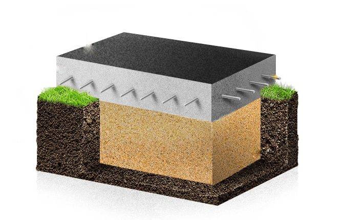 Такая опора под дом представляет собой слой железобетона или заводских железобетонных плит, уложенных на утрамбованную песчаную или песчано-щебневую подсыпку толщиной 25-30 см.