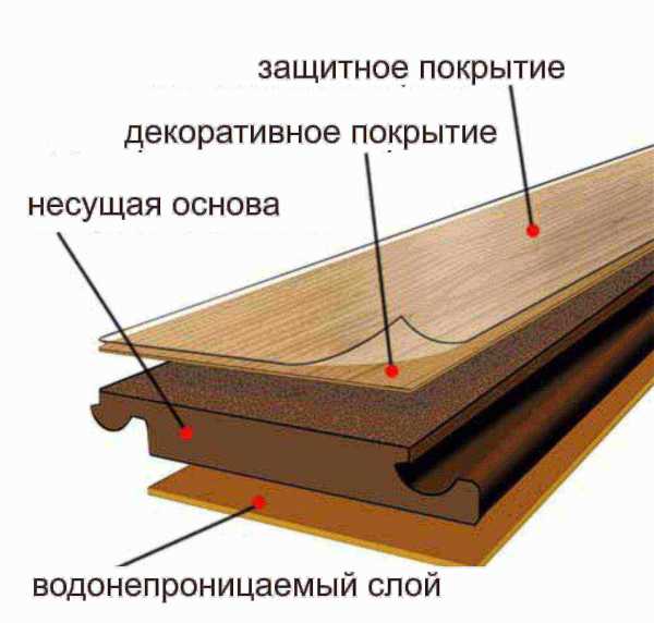 - Основной слой ламинированного напольного покрытия выполнен из ДВП или ДСП, прошедших высокотемпературную обработку высоким давлением. Обладает высокой прочностью и влагоустойчивостью, однако при попадании влаги с торцевых частей панелей с большой вероятностью испортится, приведя всё напольное покрытие в негодность.
