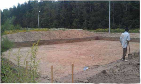 - Снимается верхний грунтовый слой, роется котлован. Глубина его должна превышать глубину промерзания почвы. Дно котлована выравнивается и трамбуется.