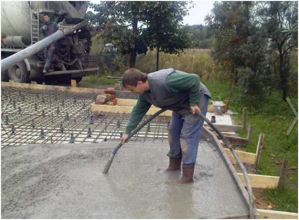 Выполнять заливку бетонного раствора лучше всего за один раз с помощью бетономешалки, поскольку делать самостоятельно бетонную смесь очень трудоемко и требует большого количества людей. Бетонный раствор в процессе заливки необходимо обрабатывать глубинным вибратором, чтобы выгнать из раствора весь воздух, который может повлиять на прочность конструкции. После полной заливки бетона, поверхность фундамента нужно выровнять и разгладить.