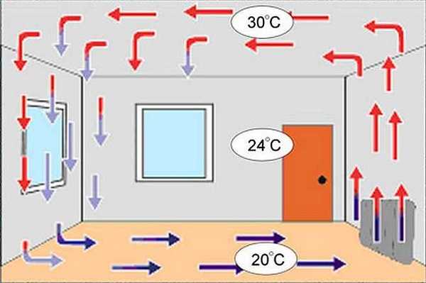 Благодаря конвекции воздух, нагретый батареей, перемещается вверх, затем движется вдоль потолка, где охлаждается, и опускается на пол по стене, противоположной от батареи.