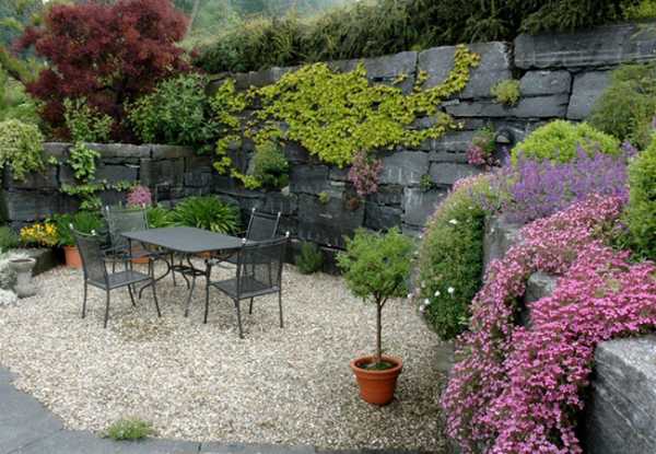 Подпорные стенки сухой кладки хорошо вписываются в природные стили ландшафтного дизайна и выглядят очень естественно. В промежутки между камнями можно засыпать землю и посадить туда неприхотливые почвопокровные низкорослые растения или мхи, это придаст ей налет старины и защитит от попадания сорняков, избавится от которых в этом месте будет довольно сложно.