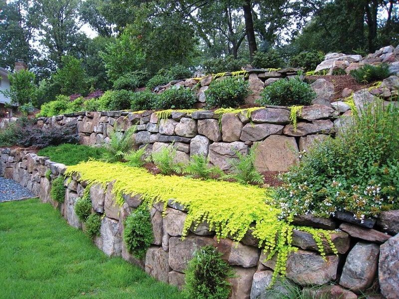 Невысокие подпорные стенки на участке можно создать своими руками, в этом случае лучше не превышать высоту 1,2 — 1.