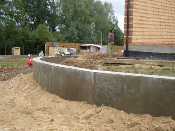 Чтобы надежно удержать грунт, особенно там, где его давление значительно, можно отлить стенку из армированного бетона. Это делают по месту, в опалубке. Помните, что в стене нужно оставить отверстия для отвода воды. Не забудьте также и об устройстве дилатационных швов через каждые несколько метров.