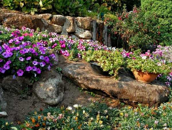 Привлекательно выглядят подпорные стены, в которых пространство между камнями заполнено грунтом, в котором высажены растения.
