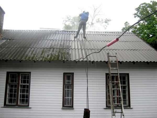 - Самый быстрый и легкий способ убрать загрязнения – использование мойки, подающей струи воды под большим давлением. Для работы можно взять приборы, которые выдают воду под давлением 200-250 атмосфер. Напор меньшей силы не очистит шифер, а больший поломает листы. Крышу площадью 100 квадратных метров с помощью мощной мойки можно обработать за 1-2 дня.