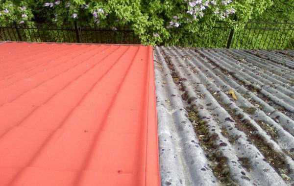Покраска шифера должна осуществляться по особой технологии. Если крышу только планируется покрывать, то материал можно окрасить на земле, а после, дождавшись высыхания слоя, настелить на обрешетку. Если кровля уже устроена, то придётся попотеть. Когда шифер эксплуатировался несколько лет и ни разу не окрашивался, то его поверхность могла покрыться налетом из грибковых образований. Неокрашенный шифер со временем покрывается налетом зелёного цвета, который впитывает влагу и создает нагрузку на кровельную конструкцию.