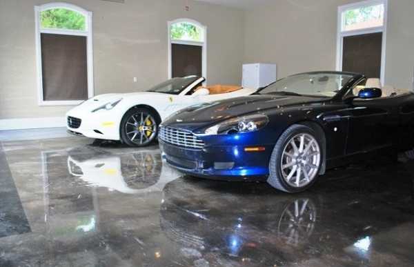 Для облагораживания обычного бетонного пола в гараже, лучше всего использовать современные наливные смеси, как показано на фото.