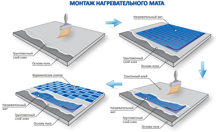Кабель укладывается в стяжку толщиной 30–70 мм с определенным шагом между витками; - нагревательные маты — изготавливаются из кабеля малого диаметра, закрепленного на сетчатой подложке, упрощающей монтаж. Может устанавливаться в клеевой слой под плиткой, толщина слоя 8–15 мм. Кроме того, не нужно высчитывать шаг укладки и заботиться о системе крепежа — мат просто раскладывается на подготовленной поверхности и приклеивается к ней;