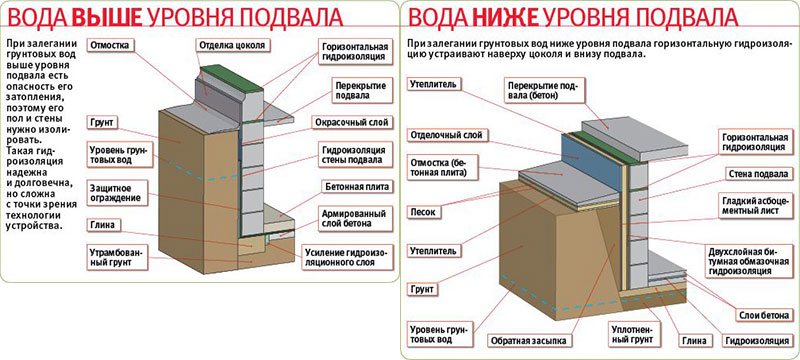 Во избежание капиллярного поднятия грунтовой воды, что приводит к печальным последствиям для дома в целом, все заглублённые конструкции должны быть изолированы не только по вертикальным поверхностям, но и по горизонтальным.