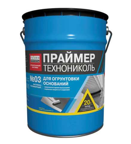 Битумно-полимерный праймер Технониколь 03 обладает повышенными адгезивными и гидрофобными свойствами за счёт входящих в состав добавок. Состав применяется для обработки металлических и неоднородных поверхностей, трубопроводов и мостовых конструкций. В продажу поступает как готовый к применению битумный праймер.