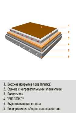 Такой пол относится к системе «теплый пол». В него входят следующие слои: напольное покрытие, подложку, цементную стяжку, бетонное основание, нагревательные элементы, экструдированный пенополистирол.