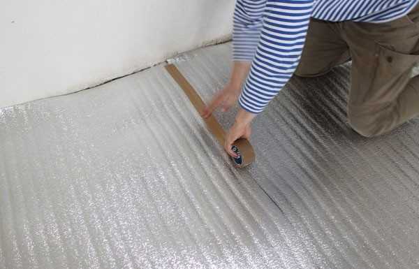 - Полотно гидроизоляции расстилается на бетонное основание с нахлестом в 10 см и проклеивается строительным скотчем. Этот слой защитит утеплитель от влаги.