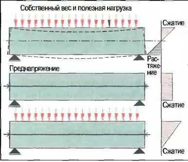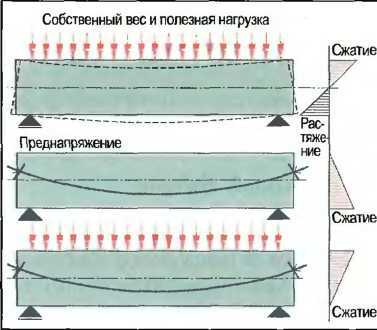 Принцип предварительно-напряженного бетона основан на том, чтобы в бетоне под нагрузкой создать сжатие там, где под нагрузкой должно было бы возникнуть растяжение. При этом прочности строительных материалов могут быть использованы полностью. Это позволяет применять меньшие сечения элементов и иметь меньшие нагрузки от собственного веса, чем при обычном железобетоне, в котором на основе связи между арматурой и бетоном в растянутой зоне сечения при увеличивающемся прогибе могут возникнуть трещины (рис. 1).