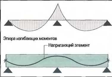 Внецентренное преднапряжение требует, в противоположность центральному, меньшее усилие напряжения и применяется, как правило, в изгибаемых элементах. Положение напряженных элементов должно соответствовать эпюре изгибающих моментов (рис. 4).
