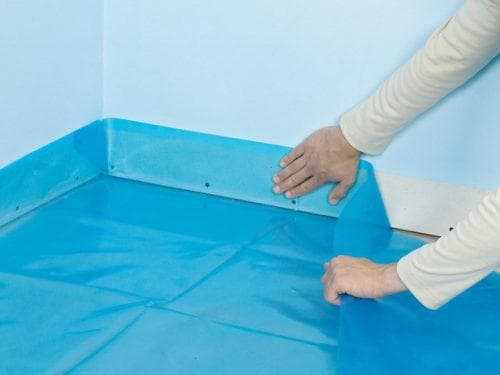 На 1 этажах бетонные стяжки укрывают полиэтиленовой пленкой для предотвращения скопления влаги. Желательна обработка цементного или деревянного основания антигрибковой грунтовкой.