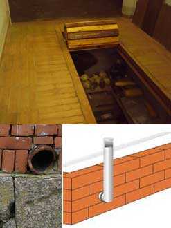 После этого происходит создание вентиляционной системы. Сначала одна или несколько труб выводятся на крышу, а затем создается несколько приточных отверстий в полу. Со стороны дома отверстия закрываются решетками.