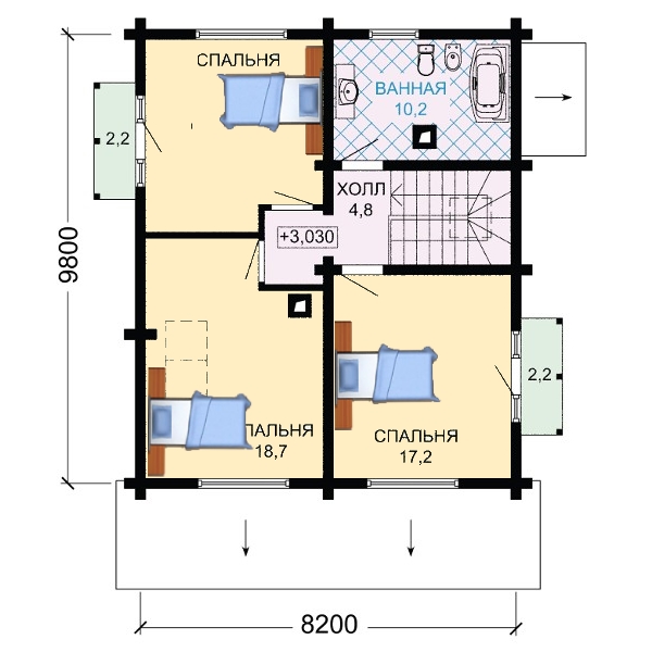 В мансарде — 4 спальни для 4-7 детей! Помещаются кровати, столы, шкафы — всё, что нужно для детского быта. Также каждая комната может вместить двуспальную кровать, на случай, если жилец подрос и завёл собственную семью, но ещё не готов к самостоятельной жизни.